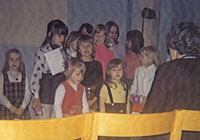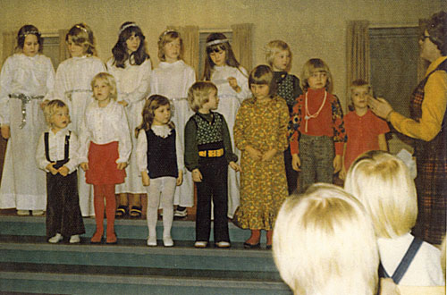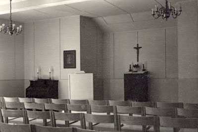 Arkitekt: Sven Boysen. GudstjänstverksamhetHuvudsyftet med Församlingshemmets tillkomst var alltså att få tillgång till en gudstjänstlokal. Behovet av en ren samlingslokal var mindre nu när Fritidsgården fanns i samhället. Gudstjänster hölls i allmänhet varannan vecka under »säsong» — under år 1964 var det t.ex. 20 gånger. Antalet besökare var då 10–30 st per gång, med ett genomsnitt på cirka 15 st. Trettio år senare var antalet gudstjänster endast 10 st och antalet besökare hade också minskat något. Vid vissa tillfällen kunde besökarantalet vara betydligt högre. Musik- och familjegudstjänster kunde locka långt över 50 deltagare. Vid gudstjänster kombinerade med familjehögtider kom också ofta många; ett dop 1971 hade 51 besökare. Årliga församlingsaftnar kunde också locka omkring 75 frufällebor. På 1990-talet kombinerades ibland gudstjänsten med tipspromenad. SöndagsskolaSöndagsskola fanns naturligtvis också. Från början, under tidiga 50-talet, var det f.d. småskollärarinnan Karin Andersson (Ängsgården), som ledde barnen på den rätta vägen. Prosten Petzäll var också närvarande någon gång, och vid ett tillfälle skulle han »käcka till sig» med en gåta: — Vad är det som går och går, men aldrig kommer till dörren? Varenda barn kan ju svara på den, men man vet ju aldrig när självaste prosten är närvarande, och från en liten flicka kom ett säkrare svar: — Jesus! Nya lärare i söndagsskolan blev Filip Larsson (Solbacken) och Ann Pettersson-Lundström (Granbacken). 1972 kom Eivor Janhager (Lillsätra) och Erna Ingerholt (Mariehill) som nya lärare och de delade sysslan så länge söndagsskolan fanns kvar, fram till mitten av 80-talet. Söndagar kl. 9.30 var den vanliga tiden. |