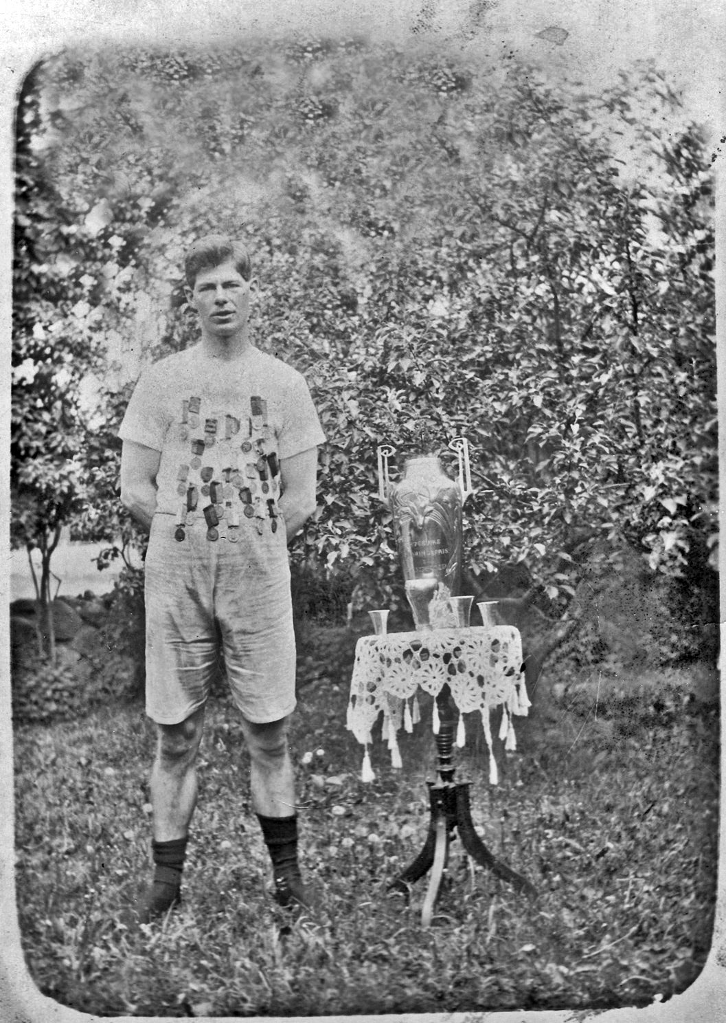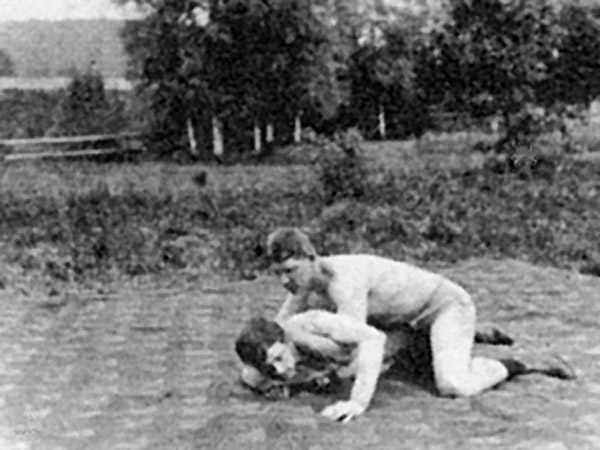 Nykterhetsrörelsens sommarhem Skogsvik. — Avslutningsgrenen i antik femkamp: brottning (Öresjö i bakgrunden).